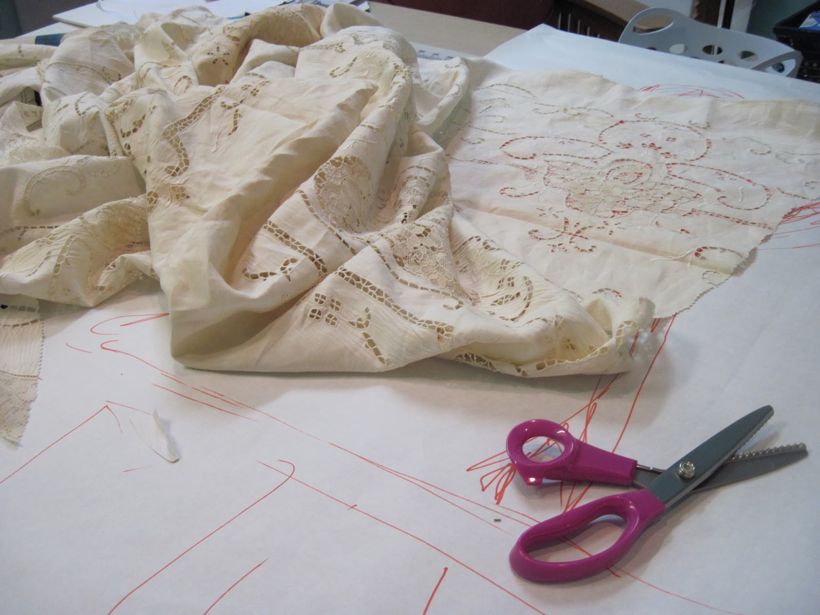 Pretty, right? And scary; really scary. I mean, once I cut into it it will no longer be a banquet cloth. On the other hand, I have no children to give it to and admonish about not leaving it folded in the same way all the time. So, deep breath, and snip...it's fate is decided. It's going to be a beautiful dressing gown for a heroine on a widow's walk.